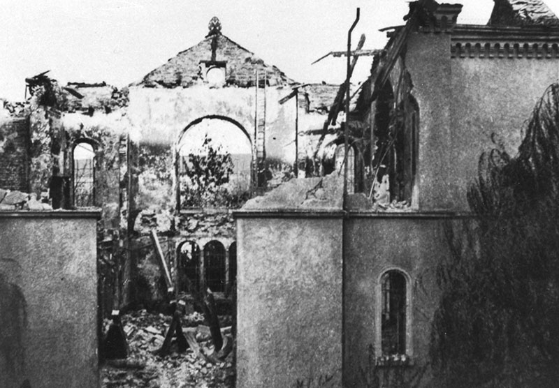 La noche del 9 al 10 de noviembre de 1938, las Schutzstaffel SS (escuadras de protección) de Friburgo pusieron en llamas la Sinagoga. Las Sturmabteilung SA (secciones de asalto) bloquearon el lugar del incendio. El cuerpo de bomberos traído al lugar impidió que el fuego se propagara a los alrededores, pero no debía apagar el incendio de la sinagoga misma. Su destrucción marca la transición de la privación de derechos y discriminación de los conciudadanos judíos a la persecución y el holocausto.
