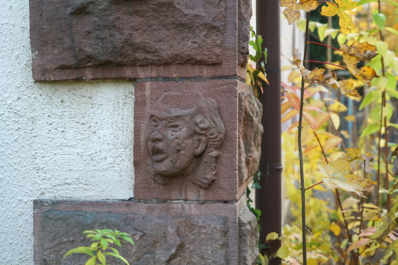 Farbfoto einer Mauer mit Steinquadern, eines davon mit eingehauener Maske