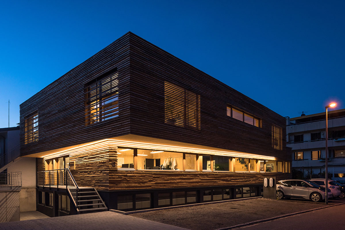 Das Bürogebäude von sutter³ liegt in einem kleinen, innerstädtischen Gewerbegebiet, in das es sich in Größe und Proportion vorbildlich einfügt. Der Baukörper entwickelt sich in Holz über zwei Geschosse auf dem massiven Sockelgeschoss des Vorgängerbaus. Die rauen, unbehandelten, annährend waagerecht eingebauten Schwartenbretter der Fassaden erinnern an die typischen Holzstapel eines Sägewerks im Schwarzwald.