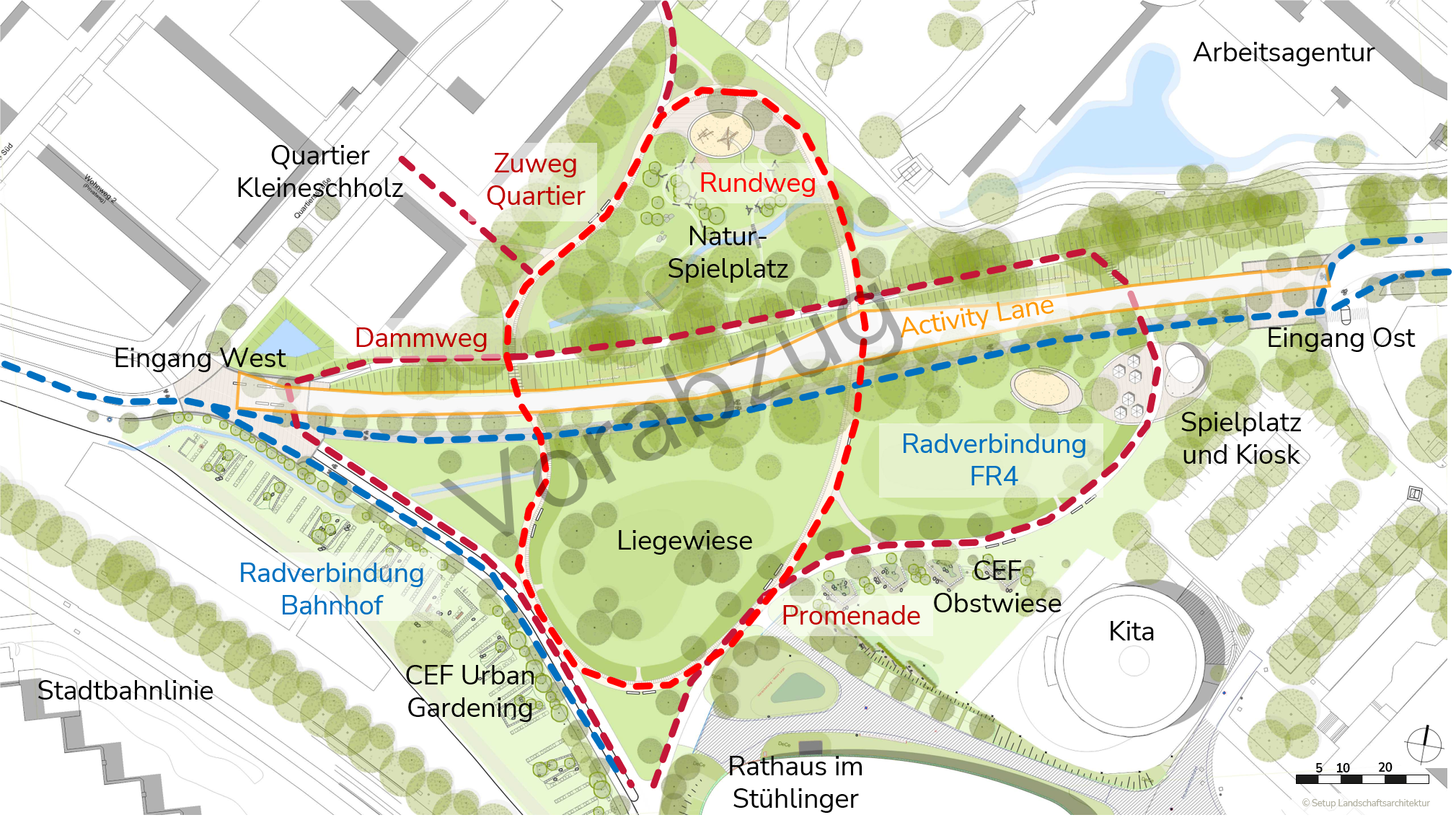 Betrachtet man den Freiraumrahmenplan, der nicht nur Kleineschholz, sondern den gesamten westlichen Stühlinger umfasst, wird deutlich, dass das neue Quartier mitten in einem Grünzug liegt, der vom Eschholzpark letztlich bis fast zum Hauptfriedhof reicht. Der neu entstehende Park wird den bestehenden Eschholzpark nach Norden erweitern.