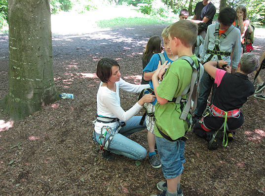 Als große, kollektive Mutprobe hatten alle Mädels und Jungs diesen Ausflug in den Hochseilgarten erlebt. Der Herausforderung, sich was zuzutrauen, die eigene Angst zu überwinden und sich in ungewohnte Höhen zu begeben, stellten sich mutig alle teilnehmenden Kinder. Manche trauten sich sogar in der Schwindel erregenden Höhe von 8 m über einen langen Baumstamm zu balancieren. Aber auch wer nur das Ende der Leiter erklommen hatte, war hinterher berechtigt stolz auf die vollbrachte Leistung und über den eigenen Mut erstaunt.